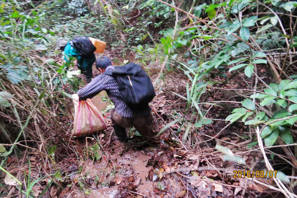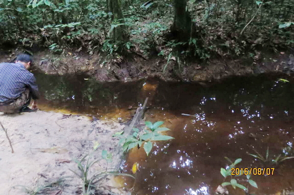 第三天开始的行程还算顺利,后来发现方向错了,原来是带路猎人对前行的路不熟了,得重新选路,只有砍树修路了,密林前行十分缓慢,两小时走了不到一公里,我们身上已经伤痕累累了,树枝挂伤、擦伤,不过都是皮外伤,无关紧要,继续前行。原计划的宿营地还有一半多行程,但时间已是傍晚,只有选择驻地了,一片树林,何处安身!正发愁,只见猎人们不一会儿功夫便砍出了一片营地,搭帐篷找水烧火煮饭,其他都很顺利,但取水困难,好在不远处有一小水塘,水为褐黄,这水能吃吗?当地人说没问题,且他们还喝生水,没办法只有将就了。