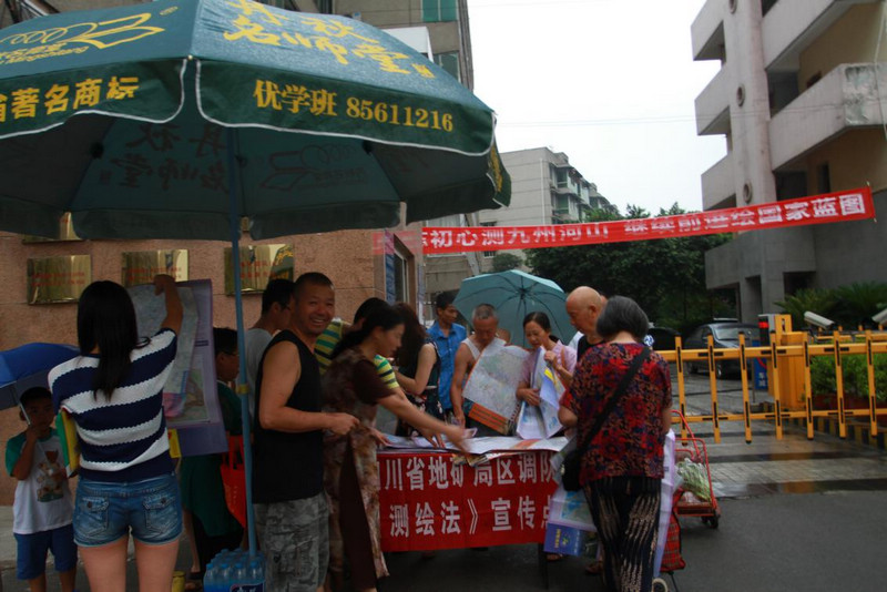 尽管“天公不作美”,雨势越来越大,但仍挡不住大家学习测绘法、了解测绘知识的热情。我单位在华阳通济桥下街设置的宣传点,被周边居民团团围住,过往居民撑着伞,纷纷冒雨前来领取宣传资料。工作人员在大雨中仍坚持给大家分发地图、普及地图知识,强调国家版图的重要性。不少居民“去而复返”,表示“希望多拿几张地图,给家里人也宣传宣传”、“带给老伙伴看看,让他们也瞧瞧”。不一会儿的功夫,宣传资料便全部分发完毕,大家拿着手中的地图,讨论最近新开的地铁和公交线路,议论今年备受关注的“南海”问题。