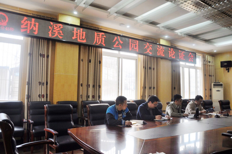 2017年4月1日,区调队队长龙化奎、党委书记沙德智、总工程师王兆成、副队长吴安东,技术部主任彭东,环资所所长宋云、总工程师曹俊与泸州市纳溪区王刚常委一行,就泸州纳溪地质公园申报的可行性开展交流论证。
