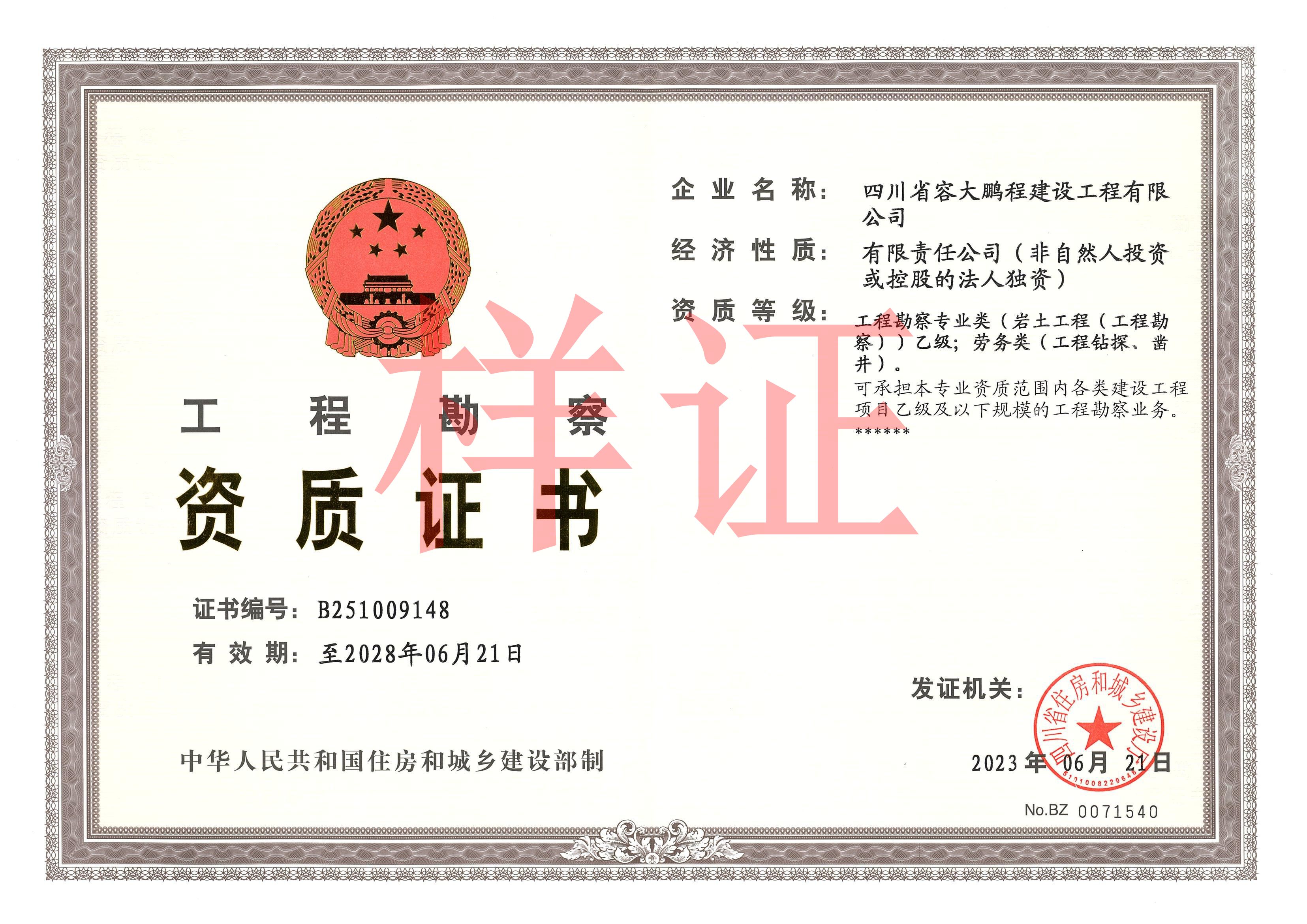 乙级工程勘察资质证书(四川省容大鹏程建设工程有限公司)