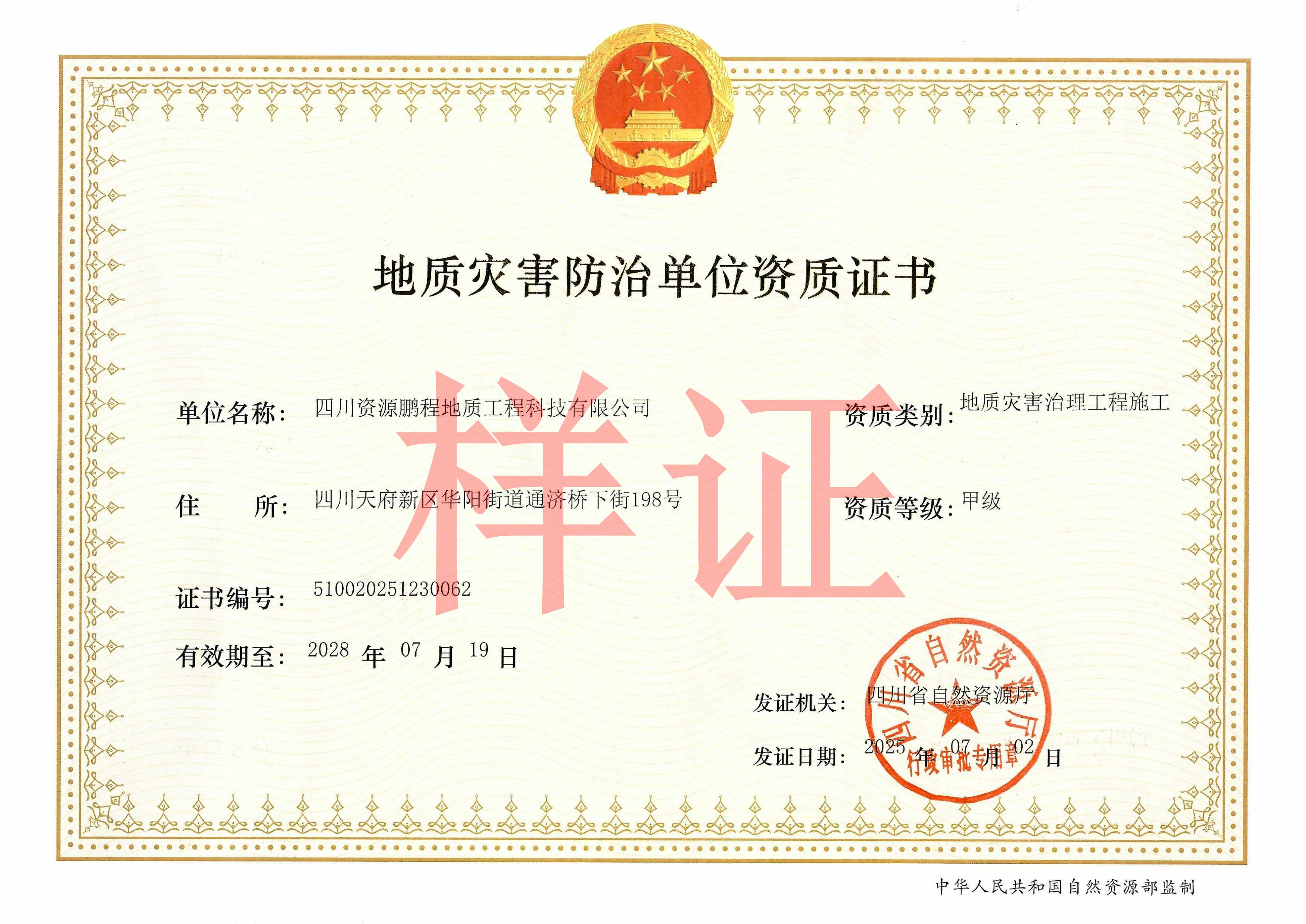 甲级地质灾害防治单位资质证书(四川资源鹏程地质工程科技有限公司)