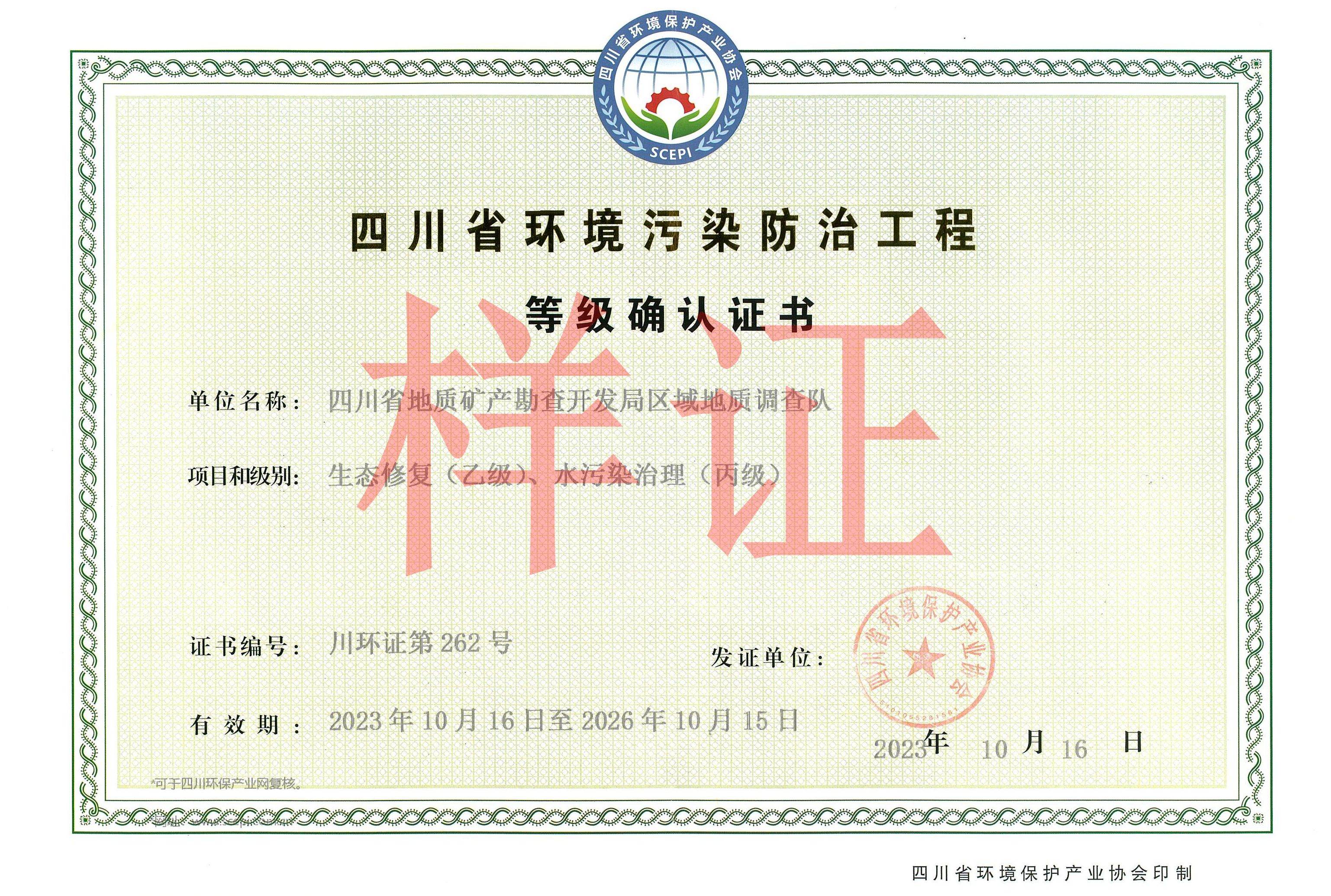 乙级+丙级四川省环境污染防治工程等级确认证书(四川省地质矿产勘查开发局区域地质调查队)
