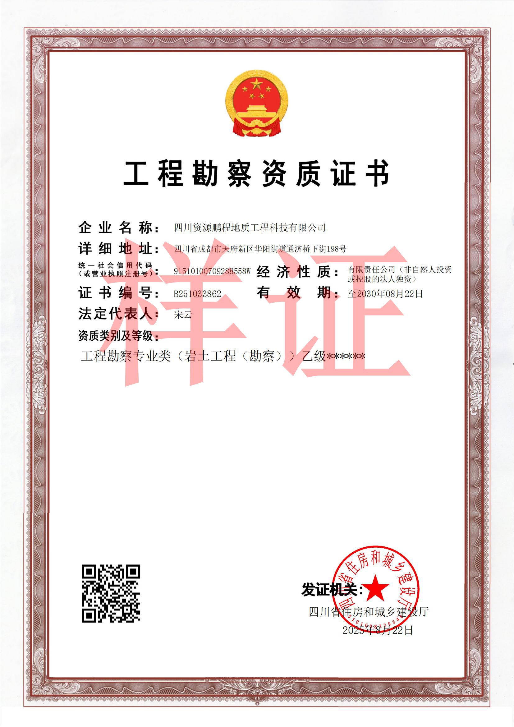 乙级工程勘察资质证书(四川资源鹏程地质工程科技有限公司)