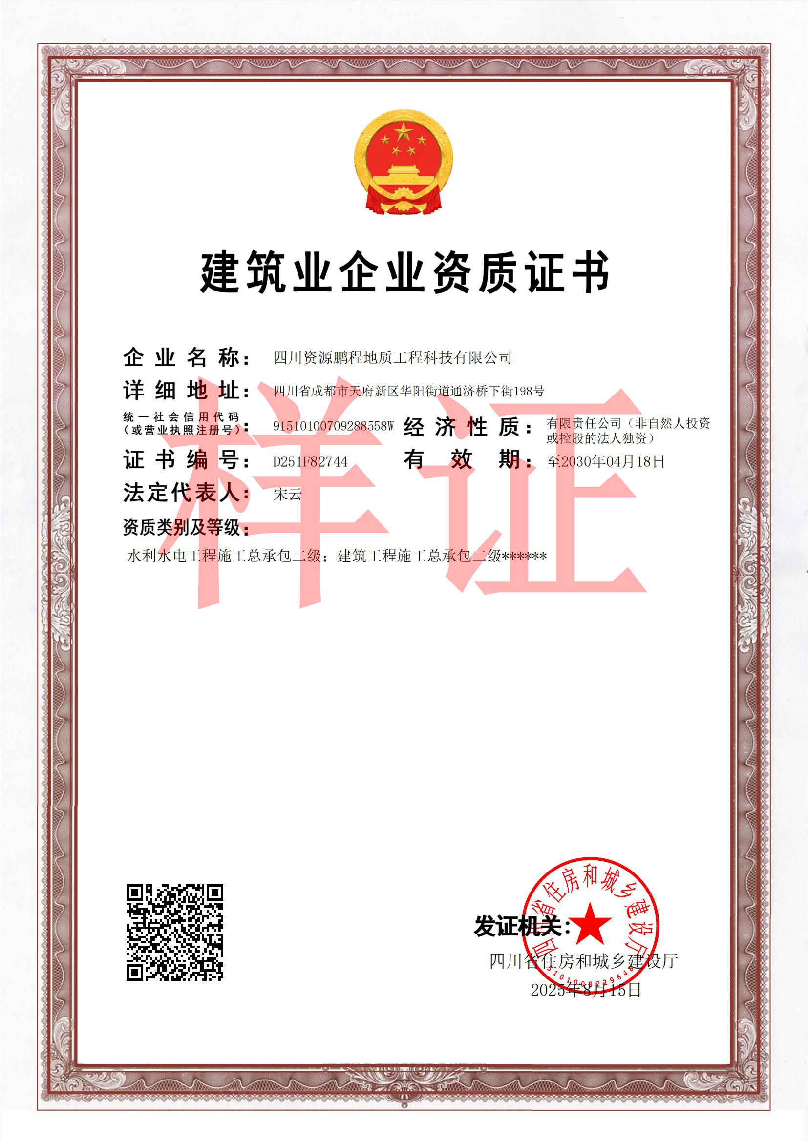 建筑业企业资质证书 水利水电工程施工+建筑工程施工总承包二级(四川资源鹏程地质工程科技有限公司)