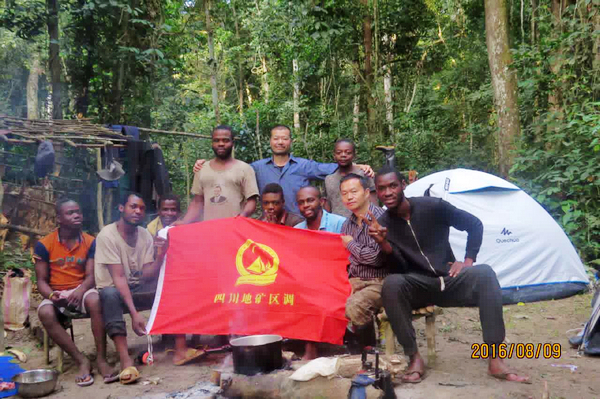 该项目位于刚果布北部souanKe(霜给县)和sembe(森贝县)境内,勘查区离最近EKobl村直距约6Km,一行10人(区调队两人,刚果布矿业部一人,翻译一人,当地居民6人),在当地猎人带领下,进入丛林。初进丛林,对于我们(两个老地质工作者)也有一种从未有过的恐惧和神秘感,第一天猎人带着我们一行,背起行装(简单的帐蓬、生活用品)沿一条小路进入丛林,林中数十米的参天大树及各种植被生长十分茂密,林中密不透风,连太阳光也照不进来,一片阴森的感觉,不一会儿,就已经汗流挟背,林中却一丝凉风都没有。总之第一天还算顺利,到达预定地点安营扎寨,夜晚的林间百鸟齐鸣,荧火虫环绕,显得格外热闹,格外温馨,早上起来,意外发现夜间猎人出去打了一支羊,大家很是高兴。
