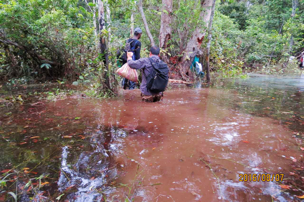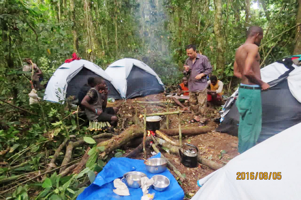 第三天开始的行程还算顺利,后来发现方向错了,原来是带路猎人对前行的路不熟了,得重新选路,只有砍树修路了,密林前行十分缓慢,两小时走了不到一公里,我们身上已经伤痕累累了,树枝挂伤、擦伤,不过都是皮外伤,无关紧要,继续前行。原计划的宿营地还有一半多行程,但时间已是傍晚,只有选择驻地了,一片树林,何处安身!正发愁,只见猎人们不一会儿功夫便砍出了一片营地,搭帐篷找水烧火煮饭,其他都很顺利,但取水困难,好在不远处有一小水塘,水为褐黄,这水能吃吗?当地人说没问题,且他们还喝生水,没办法只有将就了。