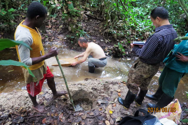 第二天开始了沿河淘砂取样工作,沿河谷行进,随处可见大象、大猩猩脚印,有的地方还发现了狮子、蟒蛇留下的痕迹,下午临近返回住地时,猎人发现了鳄鱼行踪,原来鳄鱼钻进了大树下的洞穴,猎人们用尽各种手段都没办法将鳄鱼弄出来,但嗅觉灵敏的猎人发现了附近有野猪,随着一声枪响,猎人打了一头足有百多斤的野猪,猎人们将野猪分成四块,一人背一块,高高兴兴回到住地,当晚炖了一大锅,大家分享了野猪的美味,剩下的野猪肉,猎人们将其烤成干肉,以便携带。