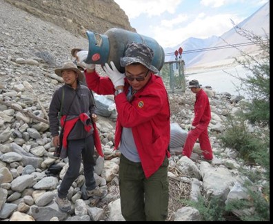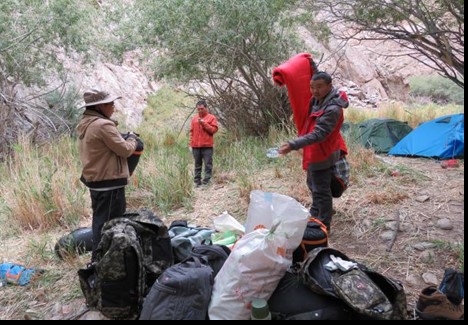 但是,新的问题同一时间接踵而至。项目临时驻地到达渡河溜索有30公里的路程,车能走10公里,15公里地段靠骆驼,剩下的5公里左右只能靠人。这么多行李、物资和设备,单靠技术员会花费巨量时间,但那又是目前发现唯一可供渡河的地方,项目组不想放弃。为了整个野外阶段工作顺利开展,大家建议——我们自己修路。修路虽然会耗掉一些时间,但是比起靠人驮还是能节省许多,并且有了路还会方便后续来回,同时也增加安全性,正所谓“磨刀不误砍柴功”。就这样,“修路项目”立项成功。