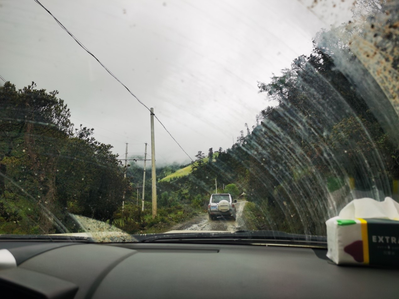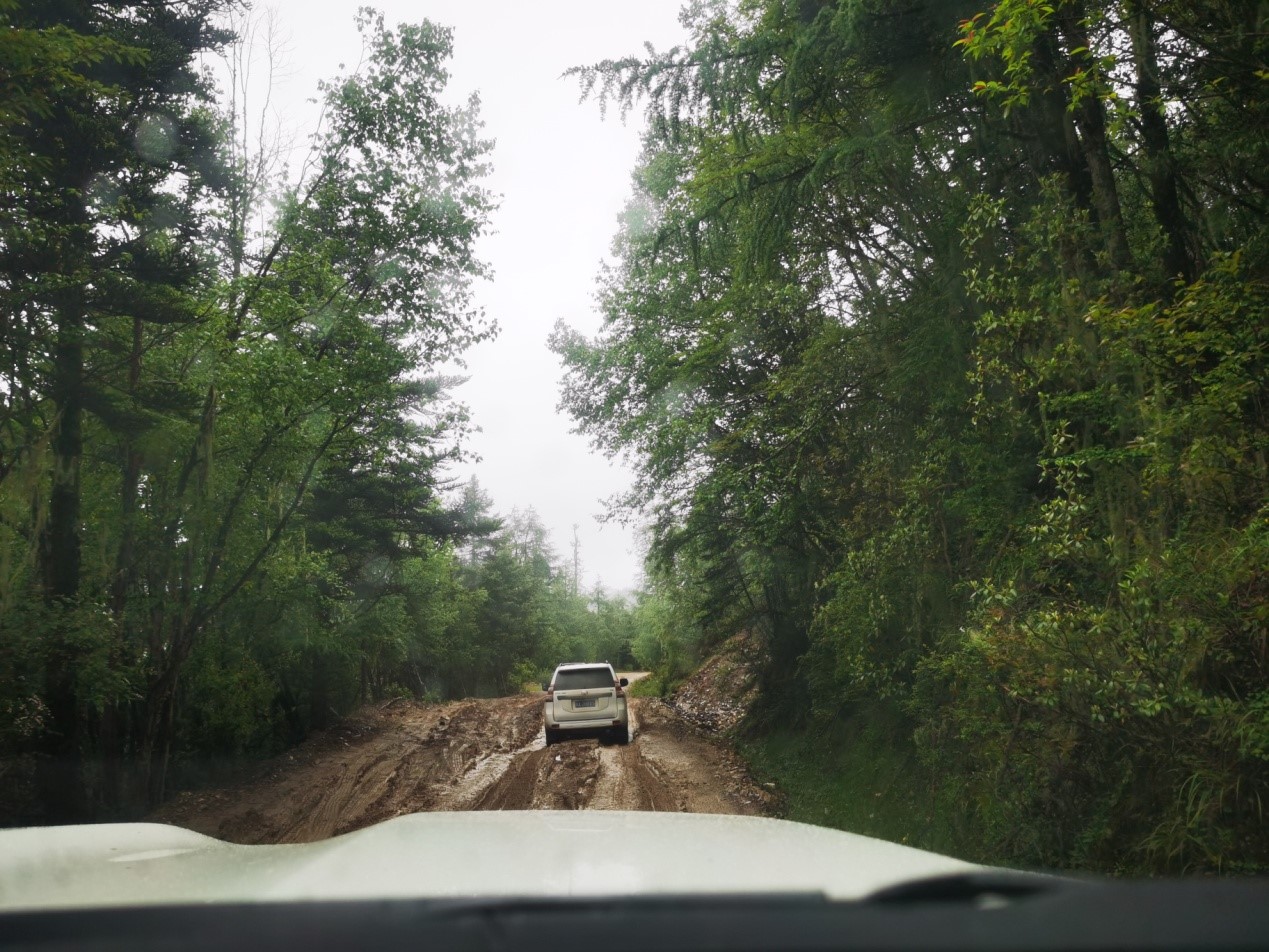 一切准备就绪,检查组一行继续向目的地行进。这次我们换车了,找了当地一名驾驶经验丰富的老司机带我们上山。木里县城到梭罗沟金矿路程近100公里,土路就有50公里。对,你没有看错,就是没有柏油、没有水泥的土路。我们来得不太是时候,5月已经是山里的雨季,道路泥泞不堪,有时候在路上还会遇到运砂石或者是金精粉的货车下山,会车相当困难。车行进到让白牧场,大家稍作休息,都在纷纷问我:还能坚持不?我还好,没有什么不良反应,两位老大哥的猜测落空了。于是我们继续前行,在艰难跋涉3个多小时后,到达了梭罗沟矿山矿部。