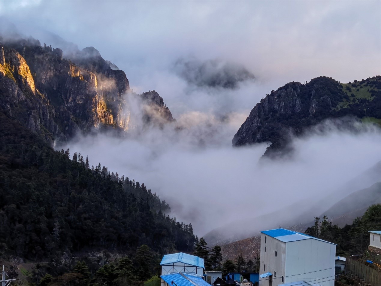 木里藏族自治县坐落于四川省西南边缘,位居凉山彝族自治州的西北,东跨雅砻江,西抵贡嘎山,南临金沙江,北靠甘孜州。境内地处青藏高原东南缘,横断山脉终端。是云贵高原与青藏高原的过渡地带。由于河流深切,岭谷相对高差很大,木里藏族自治县北部在2000米以下,中部和南部下切更深,多在2000米以上。西部与稻城交界处的恰朗多吉峰高达5958米。最低处三江口海拔1530米,相对高差达4428米。全县整个地势属于典型的高山、山原、峡谷地貌。我们住宿的地方海拔在2200米左右。