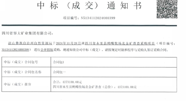 继2024年11月初中标新疆地勘基金中心“新疆克里雅河上游一带1:5万矿产地质调查项目”后,11月末,区调所又喜中凉山州地勘基金项目“四川省木里县鸭嘴牧场北金矿普查项目”,中标金额437.31万元。