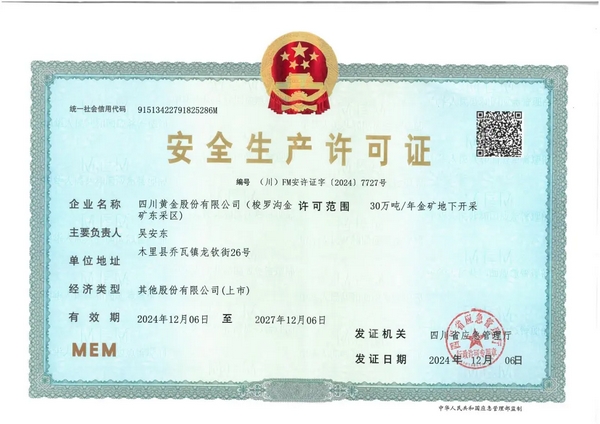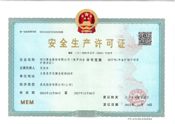 喜讯!四川黄金顺利取得地下开采安全生产许可证