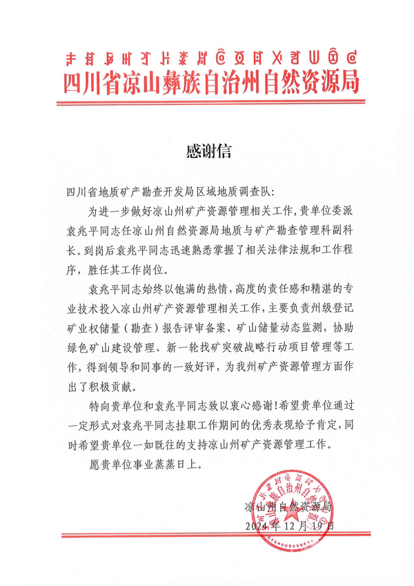 近日,四川省凉山彝族自治州自然资源局向区调队发来感谢信,对我队派出的挂职干部袁兆平在凉山州自然资源局突出表现给予肯定,对区调队在凉山州矿产资源管理工作方面的大力支持表示感谢。