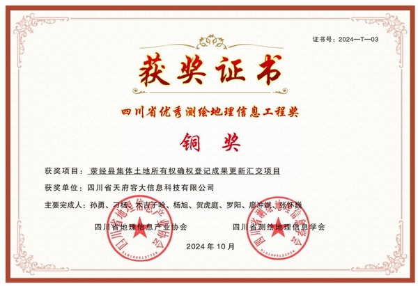 12月18日,四川省地理信息产业发展大会在成都隆重召开,会议揭晓了2024年度四川省优秀测绘地理信息工程奖项,区调队容大科技公司承作的“荥经县集体土地所有权确权登记成果更新汇交项目”荣获铜奖。