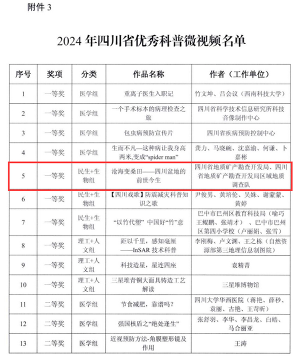 1月13日,喜讯传来!区调队在四川省科技厅主办的“2024年四川省优秀科普作品、优秀科普微视频评选活动”中,凭借两部精心打造的科普微视频《沧海变桑田——四川盆地的前世今生》和《地质“盐”味》,成功斩获一等奖和三等奖。