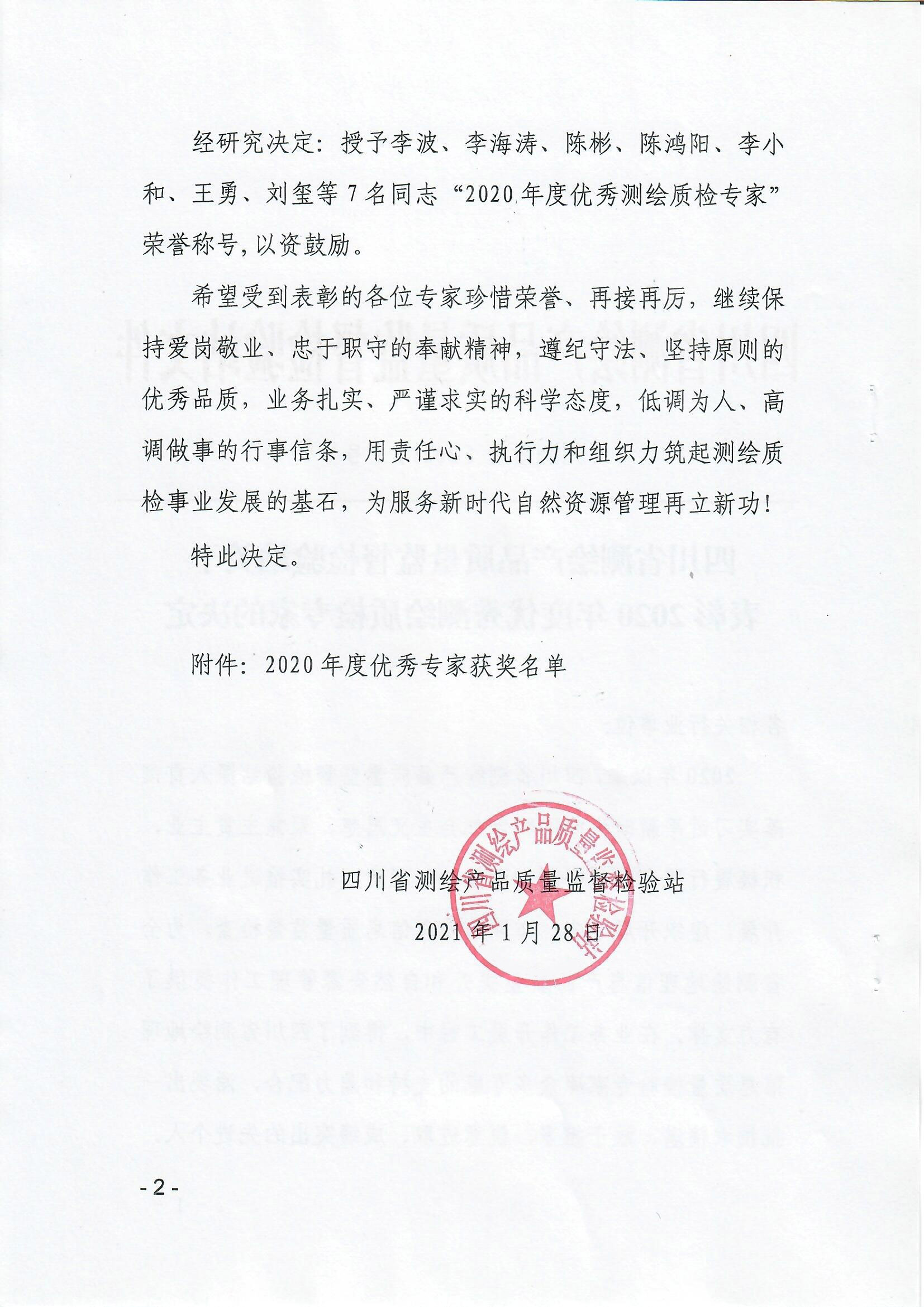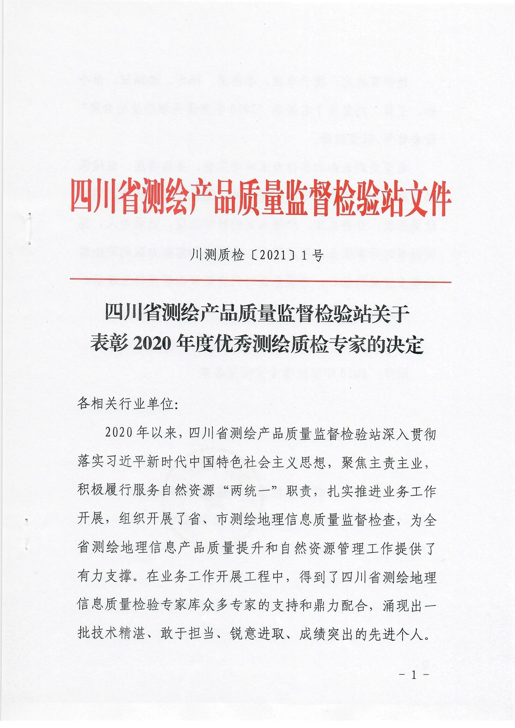 日前,四川省测绘产品质量监督检验站发布了《四川省测绘产品质量监督检验站关于表彰2020年度优秀测绘质检专家的决定》。区调队容大科技公司李波在2020年度省、市测绘地理信息质量监督检查工作中表现优异、成绩突出,被授予“2020年度优秀测绘质检专家”荣誉称号。