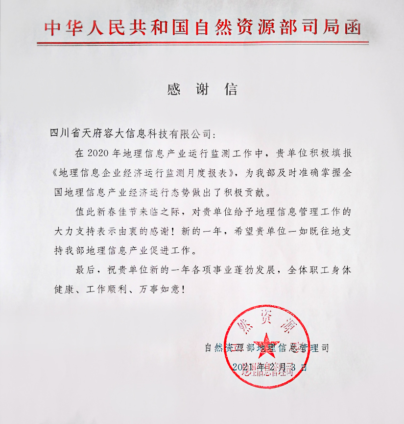 2月22日,省测绘地理信息局传来好消息:2020年度地理信息产业运行监测工作已圆满完成,自然资源部地理信息管理司对地理信息产业运行监测月报填报工作予以认可与表扬,区调队四川省天府容大信息科技公司在新年开工第一天收到了自然资源部发来感谢信!