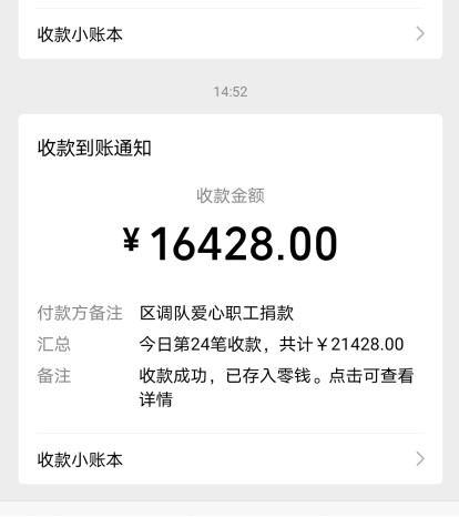 5月8日一早,区调队工会主任王大荣的手机就不停传来微信到账的声音,引得同办公室的职工频频侧目,原来是各分工会将收到的捐款汇集到队工会处。