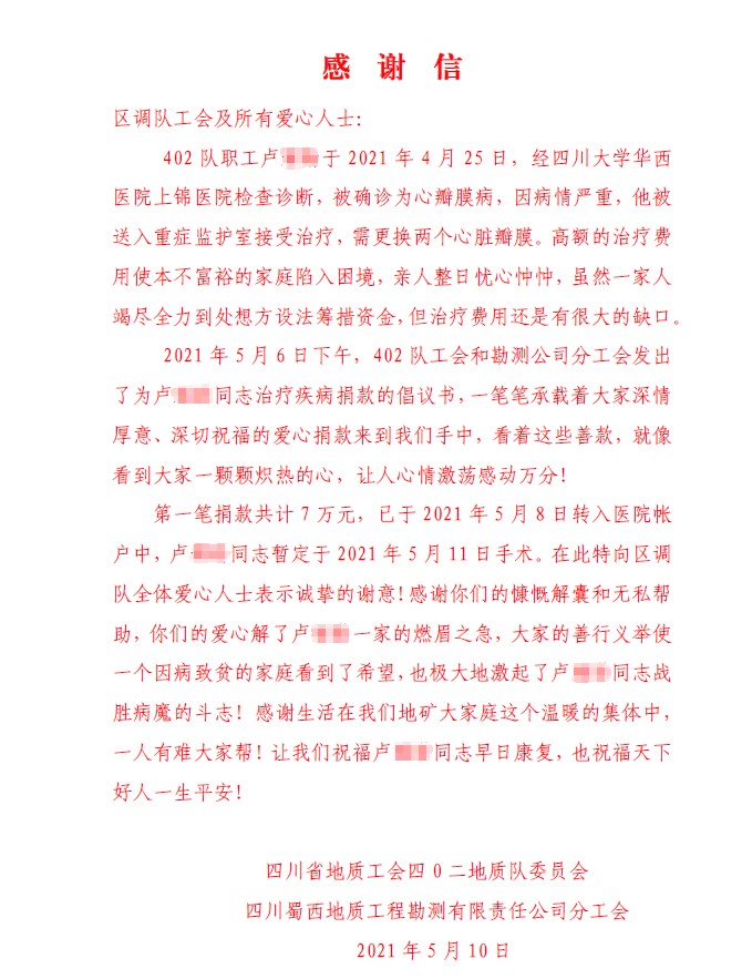 一天前,一封捐款倡议书被转发在四川省地质工会群里,这是402地质队内部发起号召该队职工捐款的倡议书:该队职工卢某某因患心瓣膜病被送往了重症监护室,经医生诊断需要更换两个心脏瓣膜,预计总医疗费用50余万元。卢某某正值壮年,作为家庭主要收入者,他的患病已对家庭造成重击,这么高昂的医疗费用更是压得他们喘不过气。