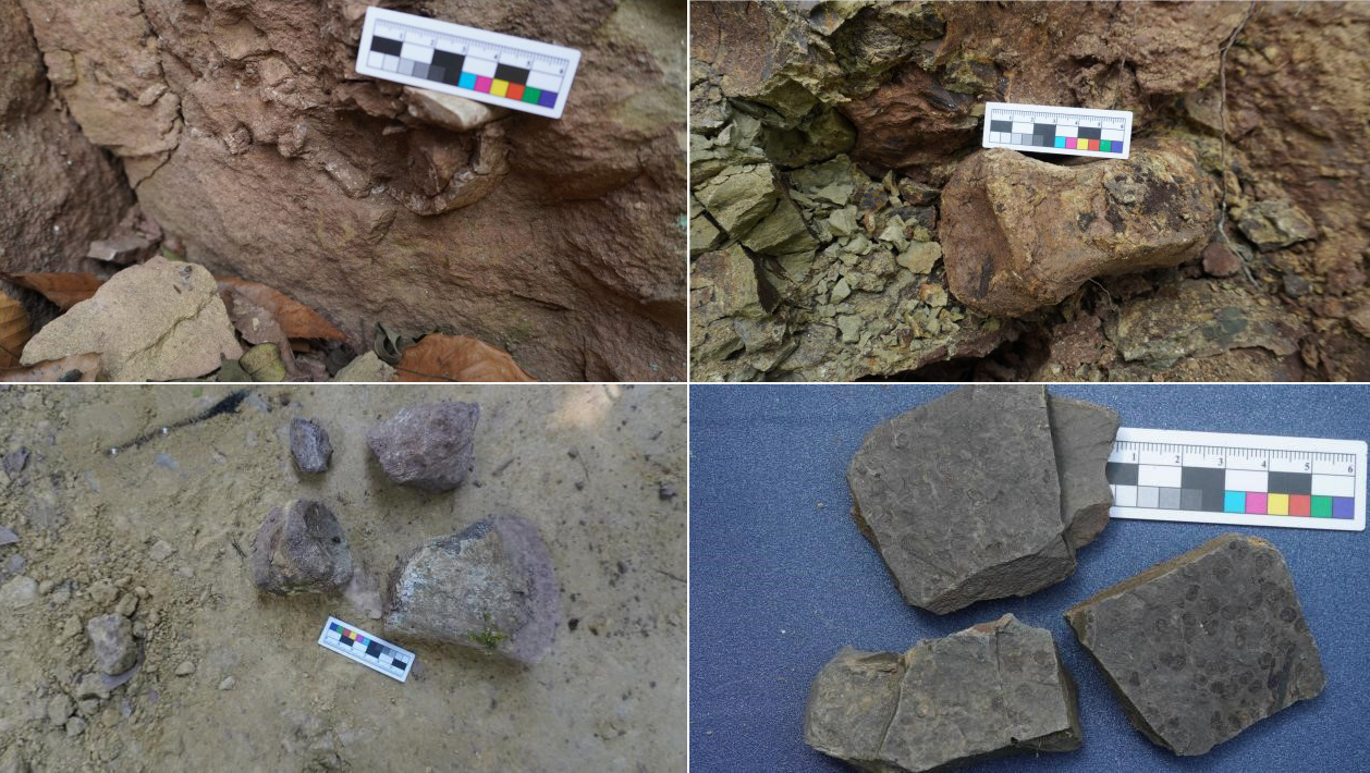 恐龙化石(左上、右上、左下)与叶肢介化石(右下)