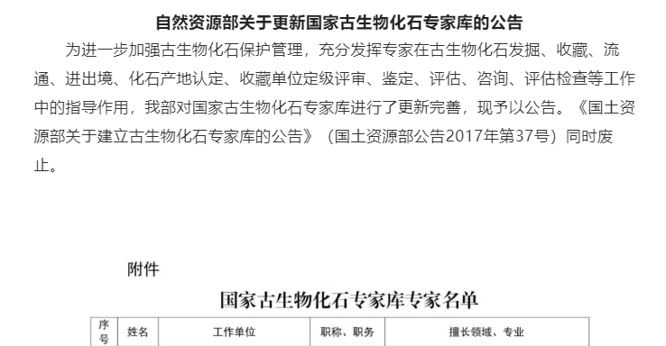 据悉,此次专家库名单更新旨在进一步加强古生物化石保护管理,充分发挥专家在古生物化石发掘、收藏、流通、进出境、化石产地认定、收藏单位定级评审、鉴定、评估、咨询、评估检查等工作中的指导作用。