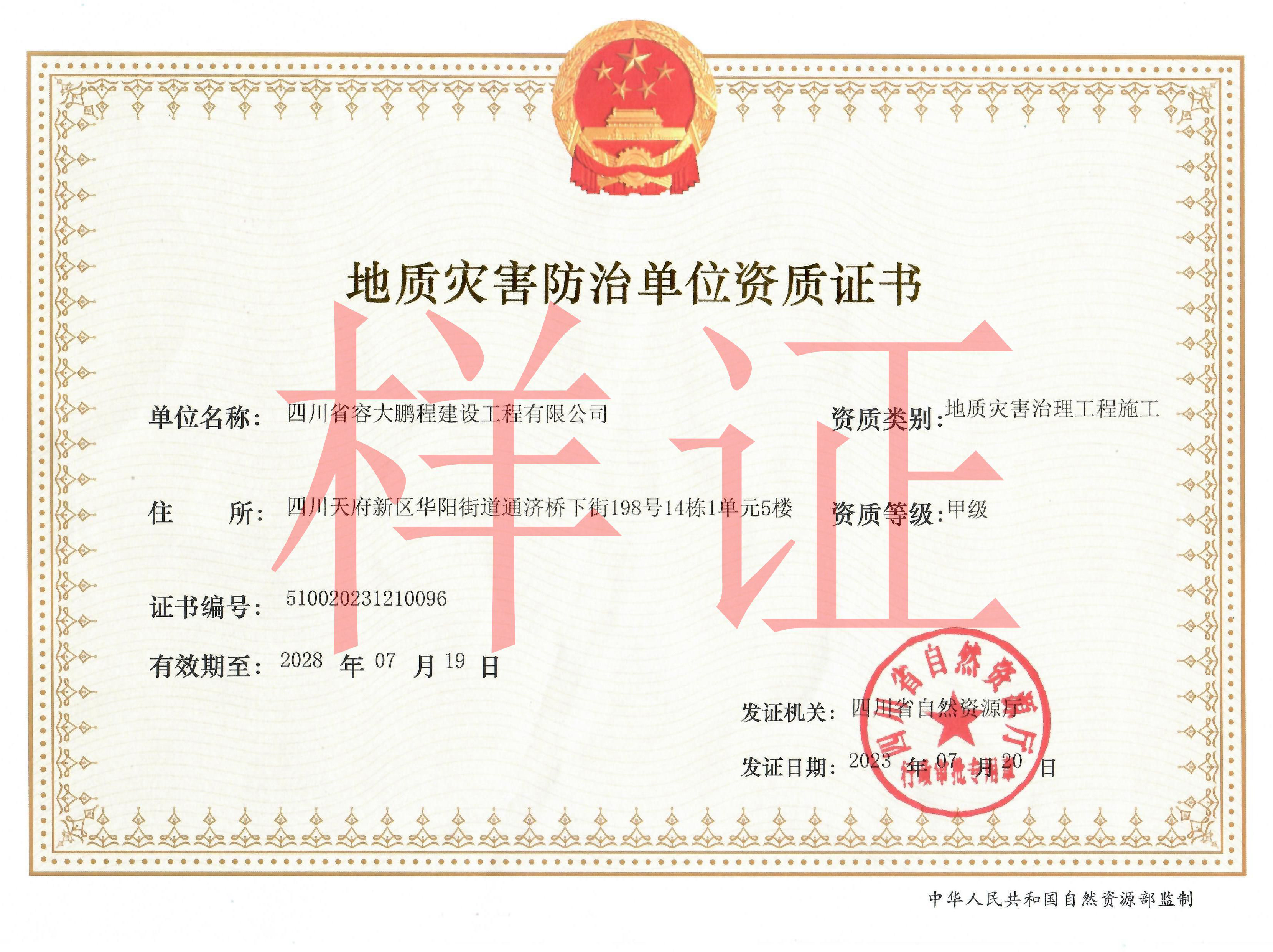 2023年7月,区调队下属公司四川省容大鹏程建设工程有限公司的地质灾害治理工程施工资质成功升级为甲级,同期申办的地质灾害治理工程监理资质(乙级)也成功取证。