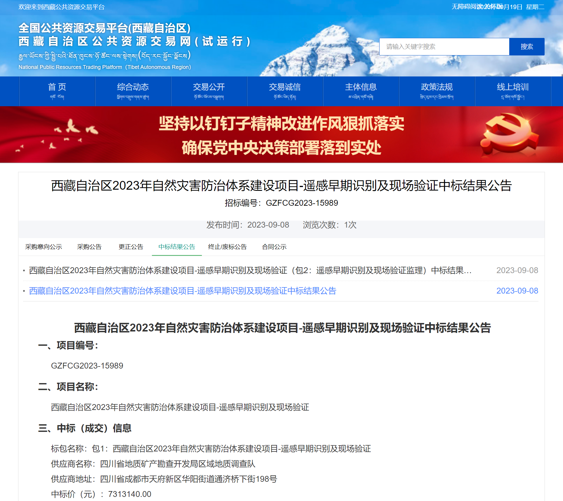 9月8日,区调队容大鹏程公司成功中标西藏自治区2023年自然灾害防治体系建设项目—遥感早期识别及现场验证项目,中标金额700余万元。