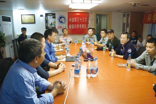 南极长城站科考队员在赴南极途中专程到“海洋六号”船进行交流 。 特派记者 吕苑鹃 摄