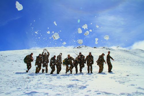 武警黄金十二支队一大队官兵在海拔5000多米高原上完成水系采样作业后欢呼雀跃。 杜小平 摄