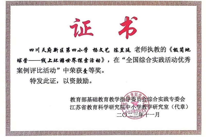 近日,区调队收到了来自天府新区第四小学发来的感谢信,感谢区调队的大力支持、刘一玲等专家的悉心指导,使天府四小教学实践活动“极简地球营项目”获得了全国综合实践活动一等奖。