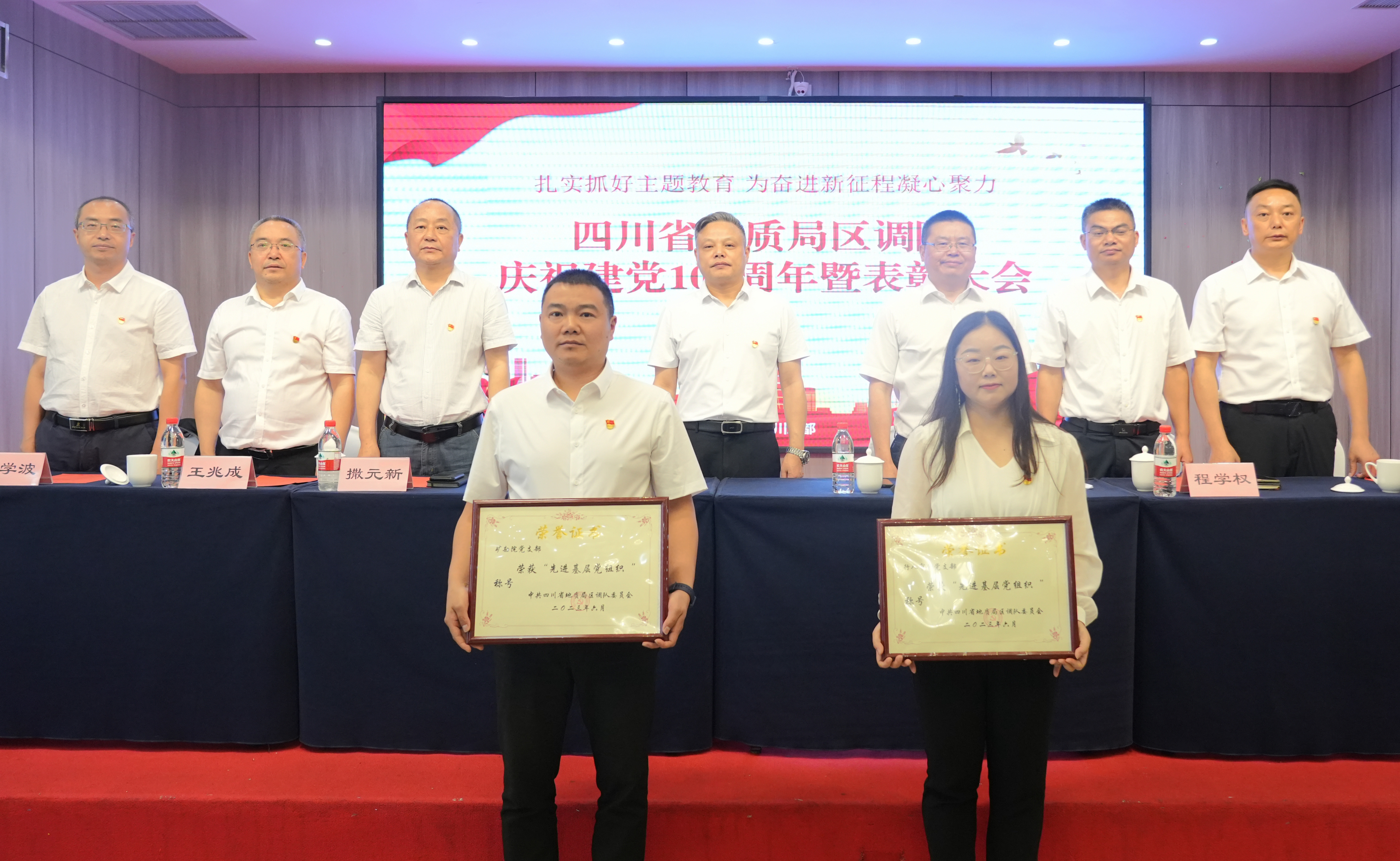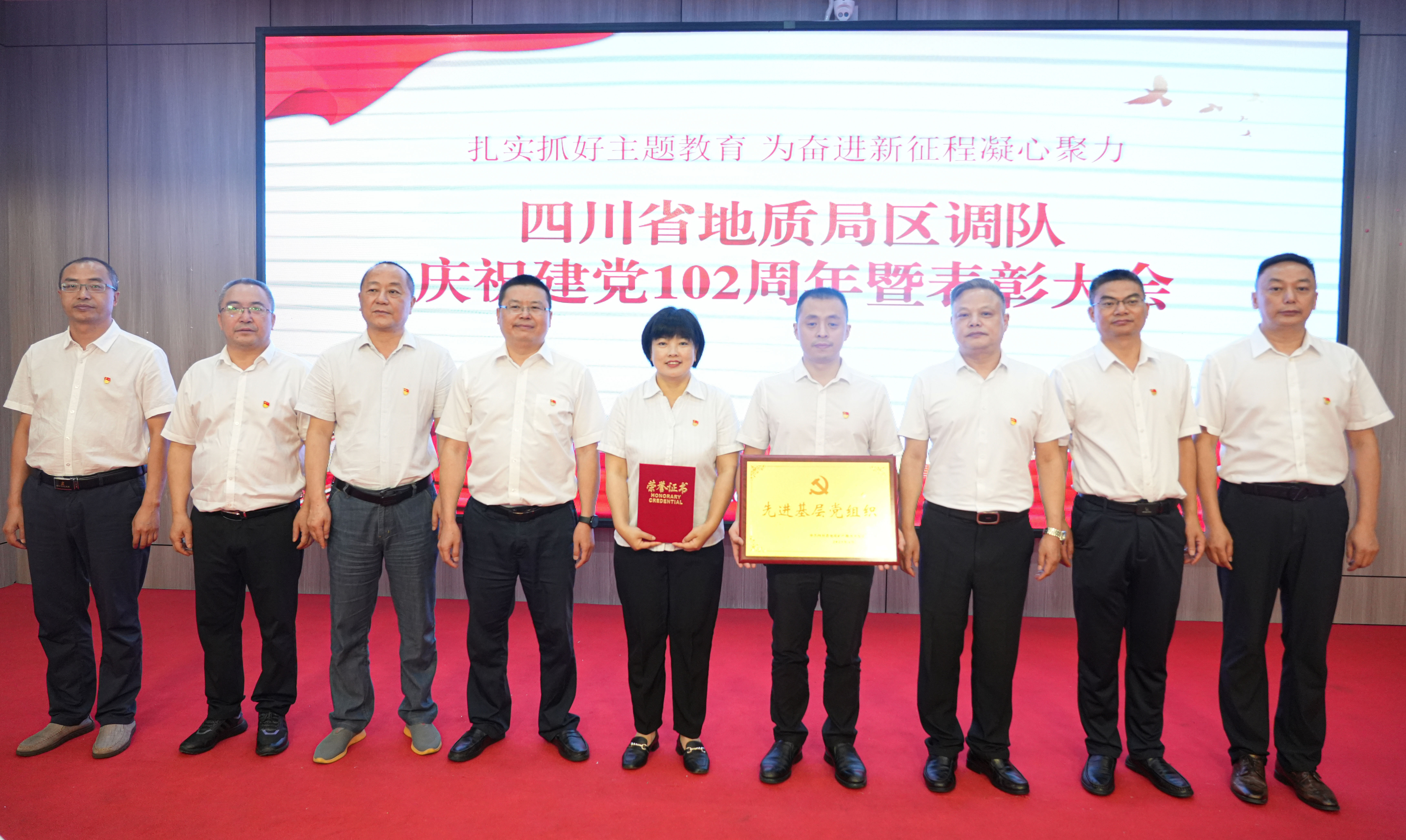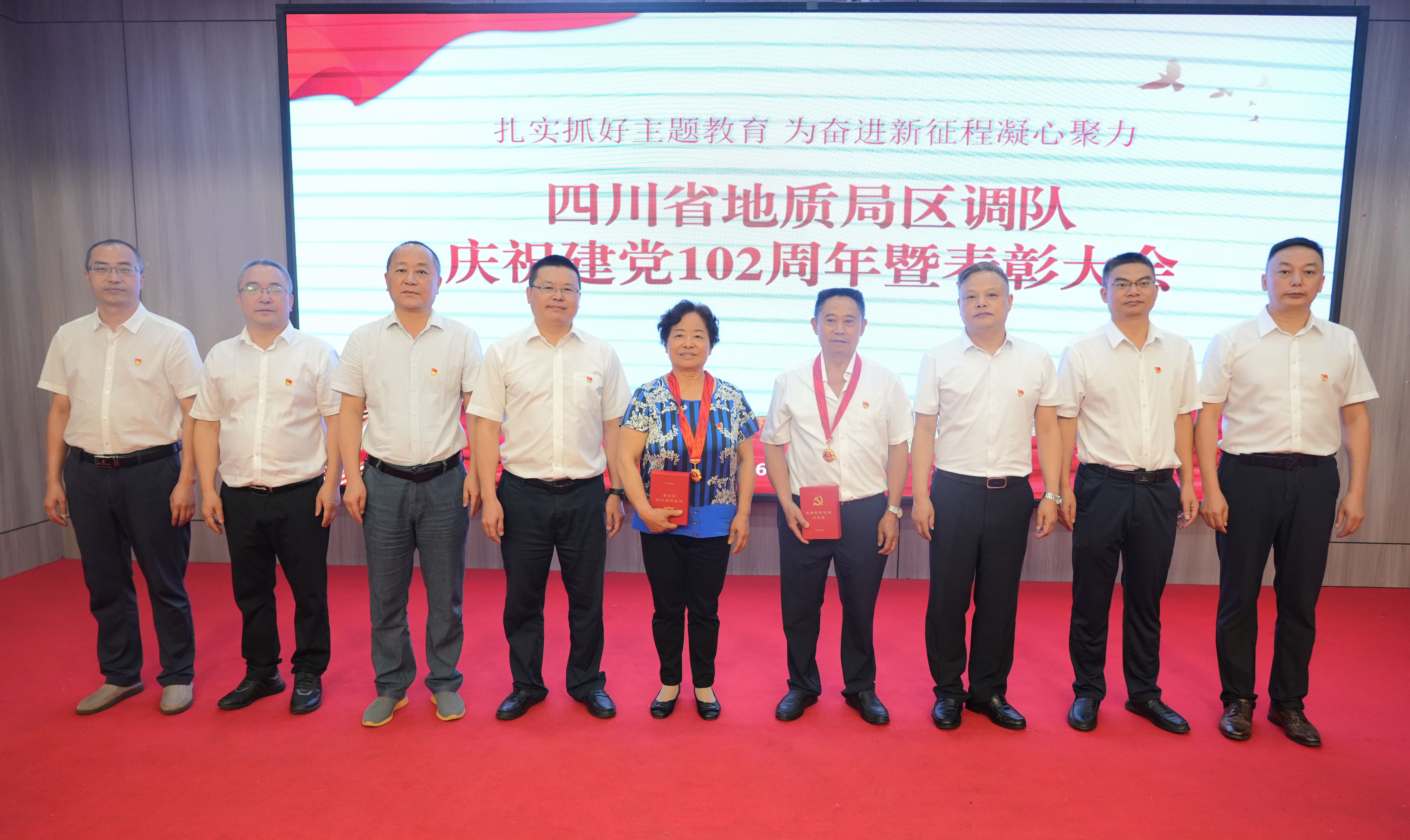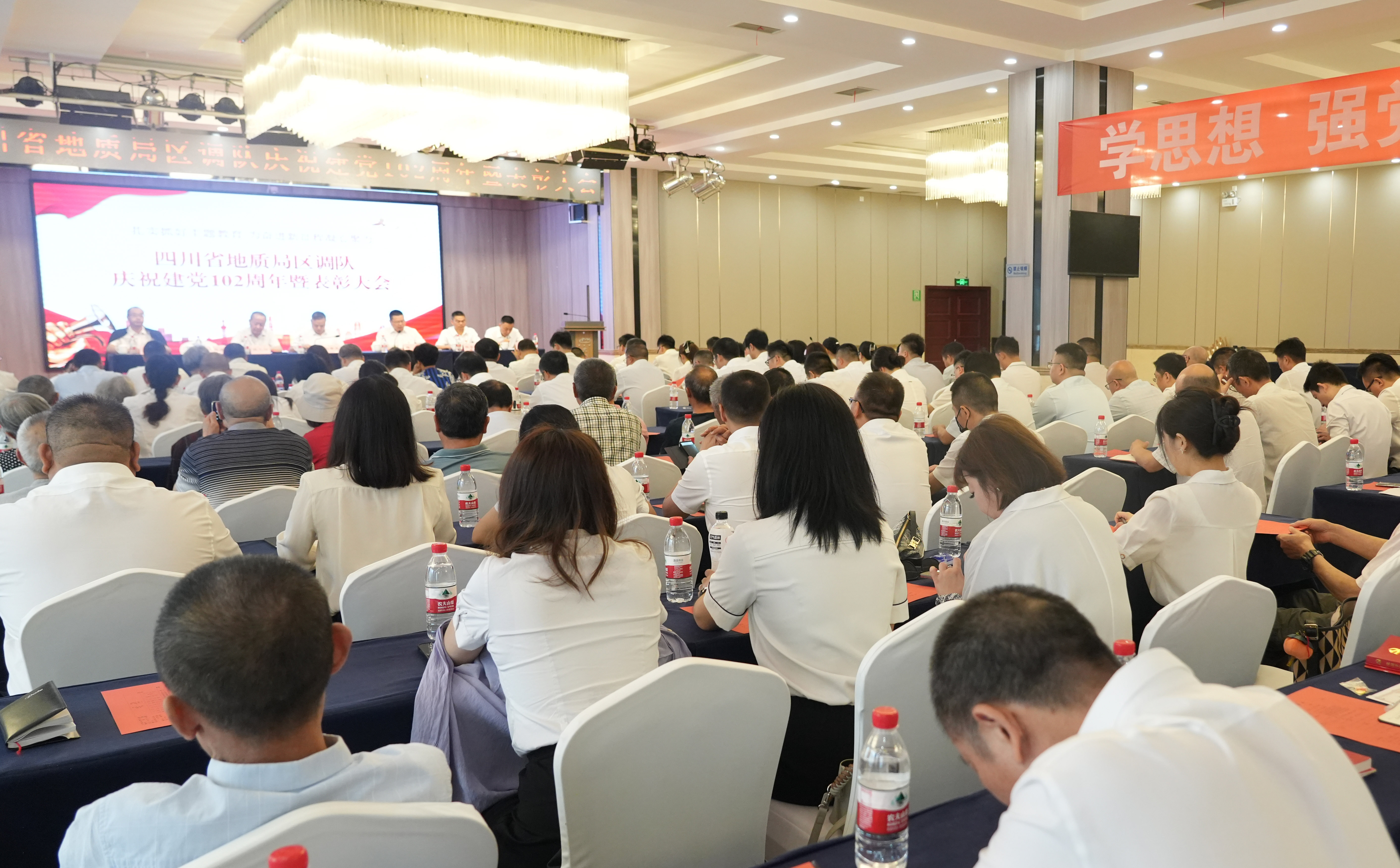 6月30日,四川省地质局区调队召开庆祝中国共产党成立102周年暨表彰大会,会场“学思想 强党性 重实践 建新功”、“以学铸魂 以学增智 以学正风 以学促干”两幅标语鲜艳夺目。区调队领导班子成员、离退休党员、在职党员干部、四川黄金经营班子共计140余人参会,会议由区调队党委书记杨更主持。